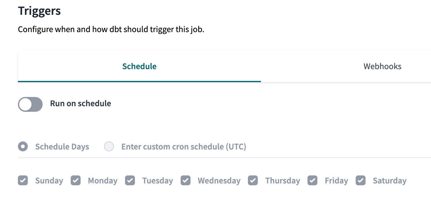 To help save compute time, new jobs will no longer be triggered to run by default. When you create a new job in dbt Cloud, you can trigger the job to run by selecting Run on schedule and completing the desired schedule and timing information.